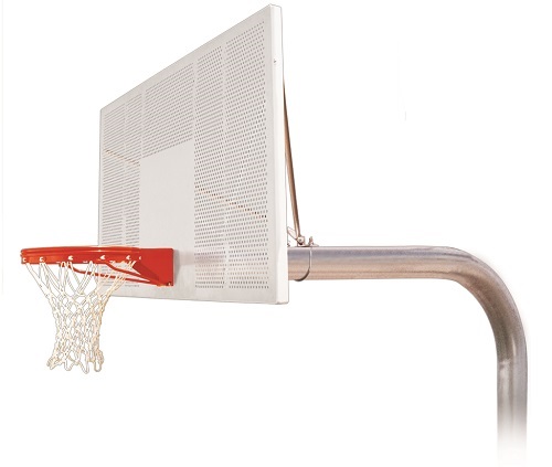 - BACKBOARD: 42" X 72" powder coated, perforated aluminum backboard. White finish with white shooter's square. The backboard has a lifetime warranty against breakage during dunking because the rim is bolted directly to the pole system and not to the backboard. You don't have to worry if someone hangs on the rim.